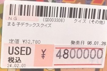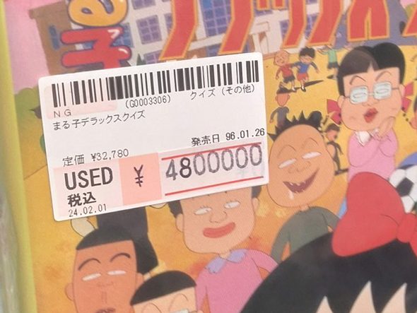 驚くような一品を発見したのは、Xユーザーのバカちん部長(@bakachin_OSAKA)さん。写真には、駿河屋のショーケース内で売られている「ちびまる子ちゃん まる子デラックスクイズ」というゲームソフトが写っています。ネオジオという家庭用ハードウェアで動作するソフトですが、その価格、なんと480万円……!! ゲームソフトとしては、破格すぎる価格です。