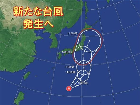 さらに、日本の南にある熱帯低気圧が今後、台風になる見通しです。台風になれば台風7号となる見込みです。台風に変わる熱帯低気圧は発達しながら北上するでしょう。予報円の中心を進めば、16日(金)頃には暴風域を伴って伊豆諸島近海に進み、東日本に接近の恐れがあります。