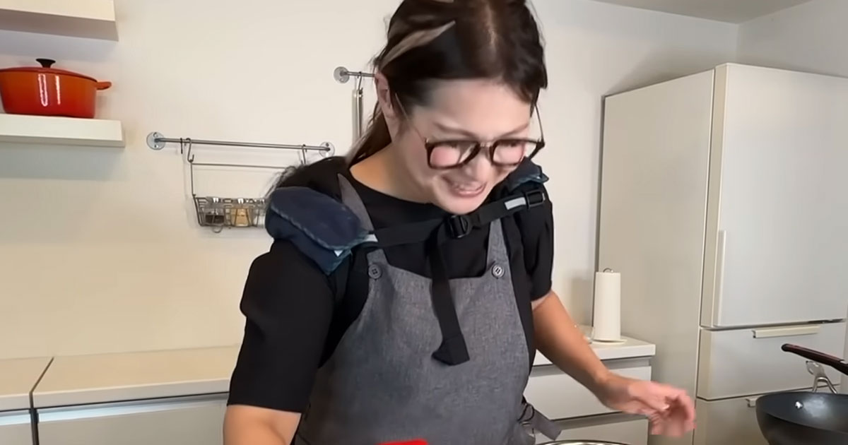 動画で、大量のオクラを消費するレシピを紹介したギャル曽根さん。2023年11月に出産した次女をおんぶしながら、手際よく料理を披露しました。