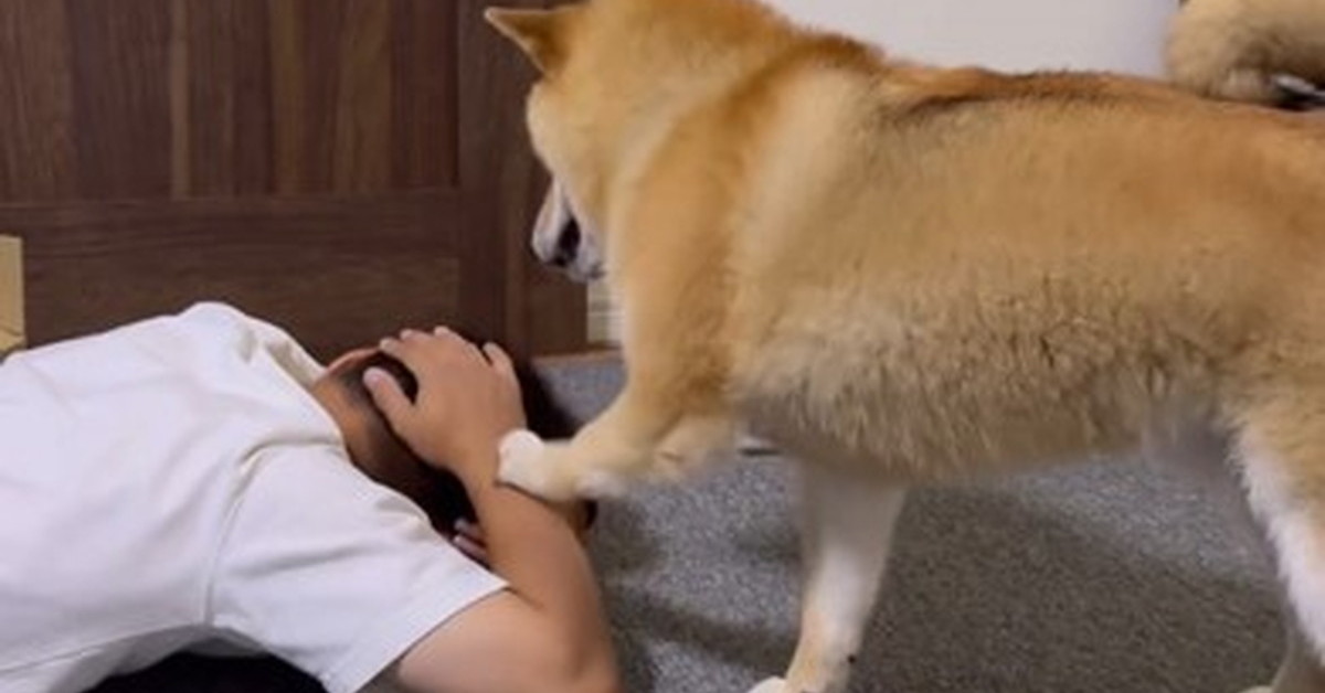 ごはんの時間に寝たフリをしたパパに、柴犬が…… “トドメの一撃”と涙目のパパに「可愛いな〜!」「嬉しそうwww」