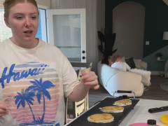 その間にジェスさんは、朝ごはん用のパンケーキを長い鉄板で一気にたくさん作っていきます。大家族ならではの朝食作りですね! そして子どもたちが朝ごはんを食べている間に、息つく間もなく今度は子どもたちのお弁当を用意。大量のランチボックスを運んできました。みんなの食事の準備だけで大仕事です。