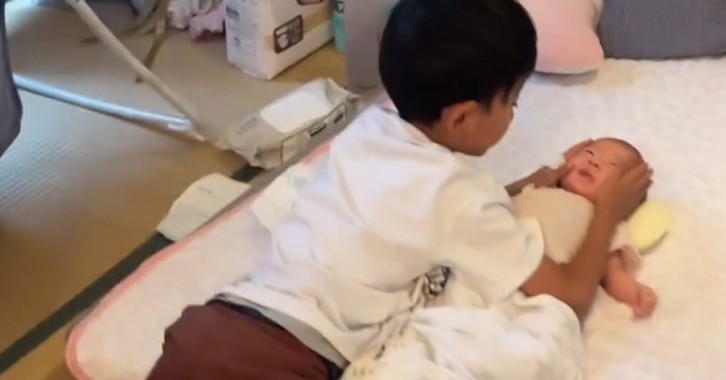 生後1カ月の妹をでき愛する7歳兄