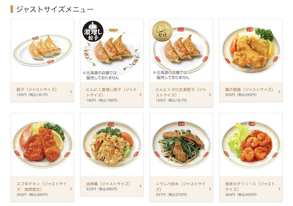 餃子の王将のジャストサイズメニュー。画像は北海道、東北、関東、甲信越のメニュー(出典:餃子の王将公式サイト