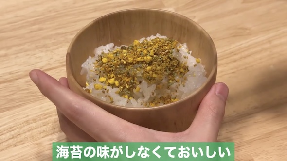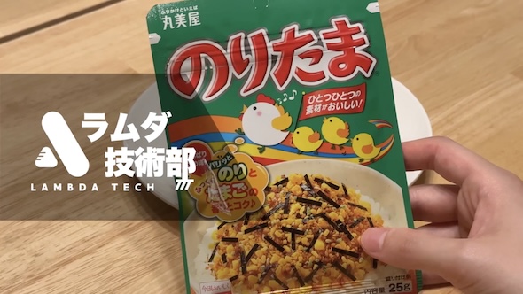 世にも珍しい“のり無しのりたま”を手に入れたラムダ技術部さんは、それを白米にかけて食べてみることに。そして一言、「のりの味がしなくておいしい」という感想を口にしたのでした。