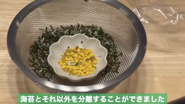 最後の仕上げとして、残ったのりたまをふるいにかけて振動では除去しきれなかったのりを集め、同じように風を当てることでほかの具材と分離します。その結果、わずか数分間で完全にのりたまからのりだけを除去することに成功! 物理の知識があれば、こんな芸当も可能なのか……。