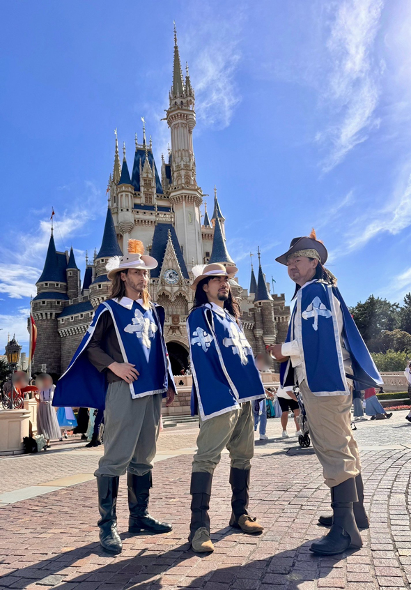 投稿者は、Xユーザーの鰐軍壮(@WANIGUNNSOU)さん。ディズニーランドのシンボル・シンデレラ城前で撮影した写真には、独特な形状をした青いマントにロングブーツ、そして雰囲気満点の羽根つきハットをかぶり、銃士の格好をした3人の男性=三銃士が堂々と立つ姿が写っています。
