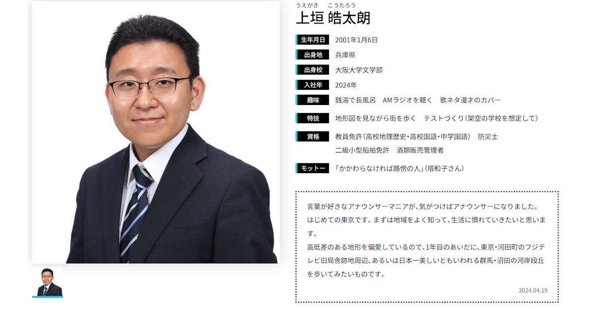 動画は、同番組の公式YouTubeチャンネル「めざましmedia」で公開されたもの。パワハラを受けているのではないかとされているのは、上垣皓太朗アナ。2001年1月生まれの23歳で、2024年入社です。