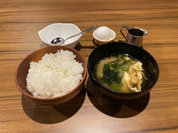 注文してしばらくすると、ごはんと味噌汁、生卵とオリジナルソースがやってきました。しっかり和風。味噌汁もワカメと油揚げ、細切りネギが入っていてリッチです。