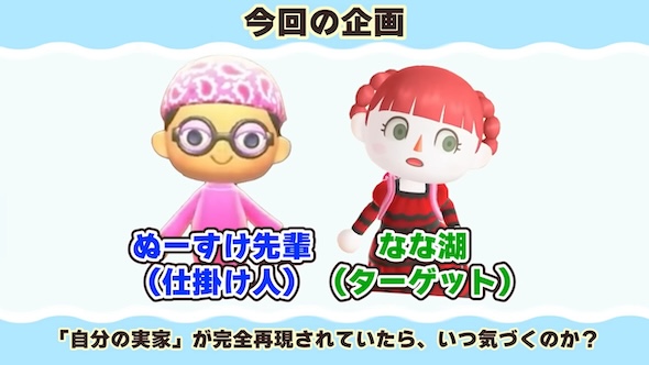 ドッキリの内容は、「『あつまれ どうぶつの森』の島に自分の実家が完全再現されていたら気付くのか」というぶっ飛んだもの。ぬーすけ先輩さんが仕掛け人となり自分の島になな湖さんの実家を再現し、ターゲットのなな湖さんを招待しました。