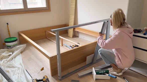 続いて、ベッドや戸棚などの家具を設置しつつ、内装を整えていきます。家具も既製品に頼ることなく、DIYするという手の込みよう。赤ちゃんが木材を倒してしまい、壁のタイルの小さな傷が付く……なんてちょっとしたアクシデントはありつつも、作業は順調に進んでいきます。