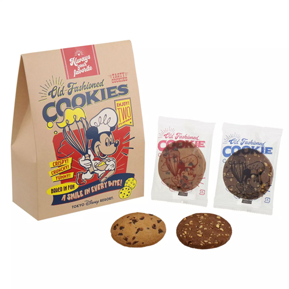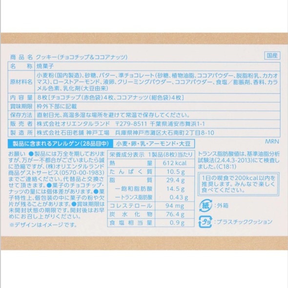 これは、「クッキー 紙箱 ミッキー」という商品で、紙製の箱の中には、チョコチップとココアナッツのクッキーが各4枚ずつ入っています。