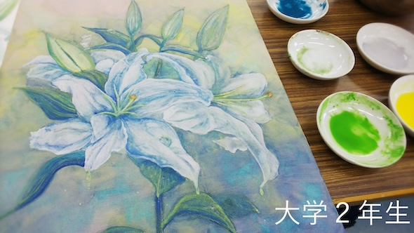 大学1年時の作品は、写実的なタッチの石こうデッサン。続く2年時の作品は、絵の具で描かれた美しい白百合の絵です。
