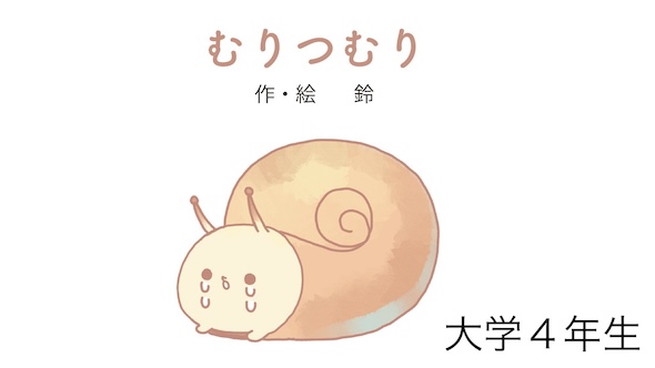 ところが大学4年時の作品は、これまでの画風とは正反対の、シンプルでデフォルメされた絵柄の「むりつむり」というキャラクター。殻の中にこもって涙を流すカタツムリは、現在の湊谷さんの作風に通じるソフトでかわいらしいタッチです。