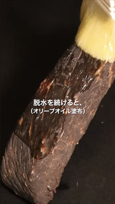 オリーブオイルを塗ってからガーゼで包み、さらに1カ月熟成させる