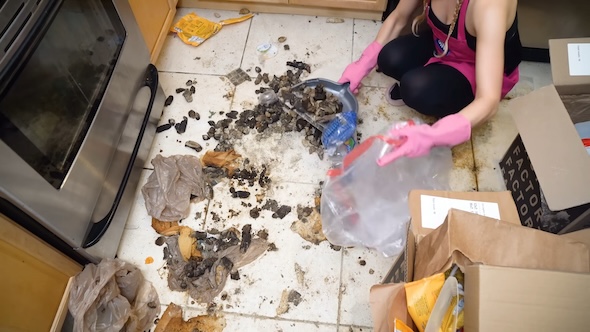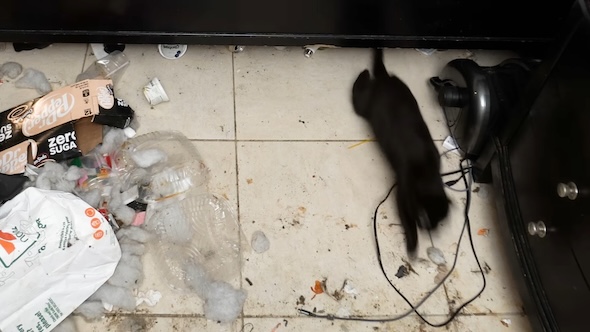 寝室の掃除中には、思わぬサプライズが。ごみがたまったベッドの下から、1匹の黒猫が飛び出してきました。この家には男性とペットの犬だけでなく、猫も住んでいたのです。