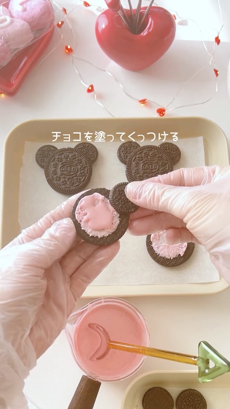 まずはミニオレオのクッキーをはがして2枚に分け、中のクリームを取り除きます。通常サイズのオレオも一度はがし、ミニオレオを耳の位置に1枚ずつ挟んでミッキーマウスのシルエットに。このとき、溶かしたイチゴ味の板チョコを間に塗って接着剤代わりにします。