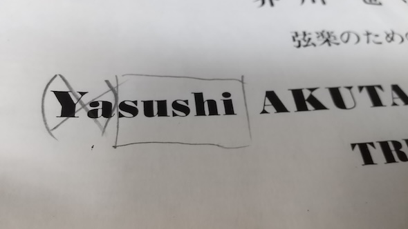 ローマ字表記された作曲者名「Yasushi AKUTAGAWA」の「Ya」の上にバツ印が書かれ、残った「sushi」を四角で囲って強調しています。sushi……寿司!