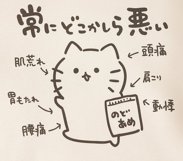 ゆるいタッチで描かれた猫のデザインがかわいいパーカー……ですが、イラストにはデカデカと「常にどこかしら悪い」の文字が書かれ、「肌荒れ」「頭痛」「胃もたれ」「肩こり」など、あらゆる不調の症状名が並んでいます。