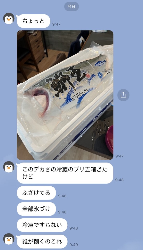 販売ページにはしっかり「フィレ」と明記されていたものの、食べやすくさばかれたブリが定期便で届くと勘違いしてしまったべいちゅーさん。仕事中に家族から届いたLINEのメッセージで、自身のミスに気付きました。LINEの文面は「このデカさの冷蔵のブリ5箱来たけど」「ふざけてる」「誰が捌くのこれ」と、冷静ながらも怒り心頭の様子。帰ったらどうしよう……。