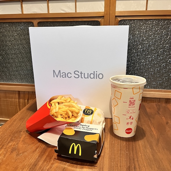 よく見るとバーガー類の後ろに、マックはマックでも「マクドナルド」ではなくApple社が販売するコンピュータ「Mac」の箱があります。60万円とは、その「Mac Studio」を合わせた金額だったのでした。Mac Studioさえ付けなければ1000円くらいでマクドナルドを食べられるなんて、お得!
