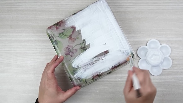 用意したのは、何の変哲もない四角いプラスチック容器。そこに除光液を塗ったのち、ニスを使って花柄のシートを貼り付けていきます。