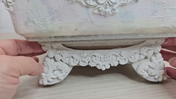 全体を乾かす間に粘土を型取りして美しい装飾パーツを作っておき、容器が乾いたら装飾パーツを取り付けます。再び白い絵の具で外側を塗り、仕上げに装飾パーツを金色で彩色したら完成です。