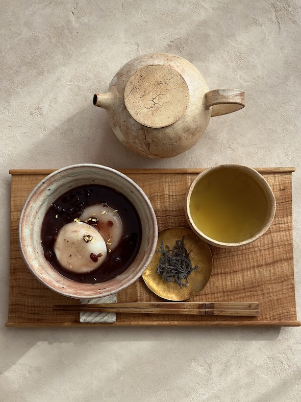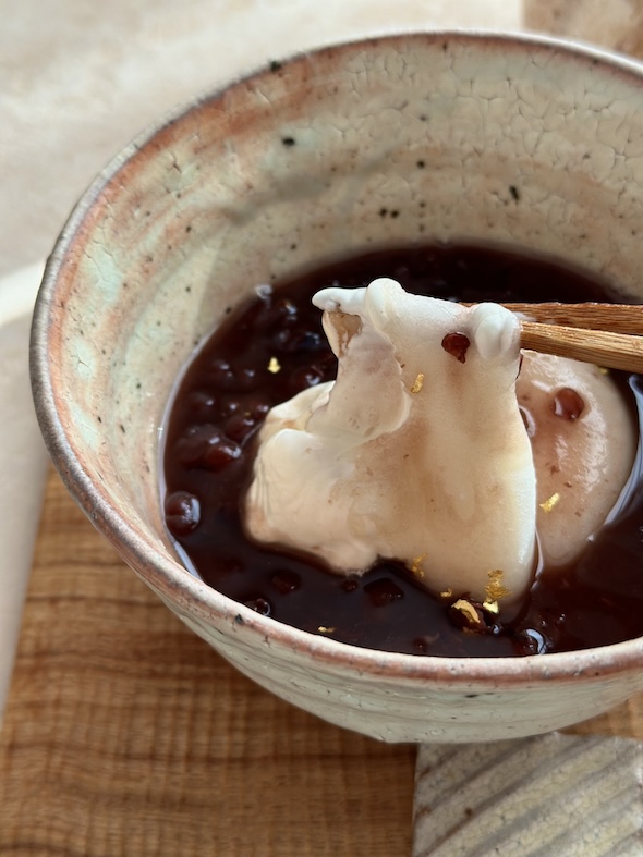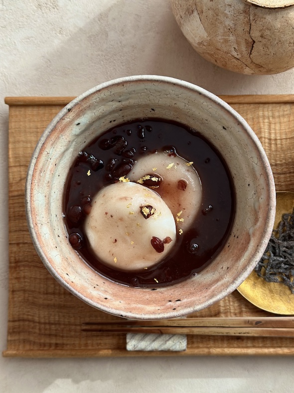作り方は簡単。缶のゆで小豆に塩と水を加え煮て、そこに雪見だいふくを入れるだけ。さらにmocchiさんは金箔を散らしたり、美しい器に付け合わせの塩昆布やお茶を用意したりと、盛り付けにもこだわりました。