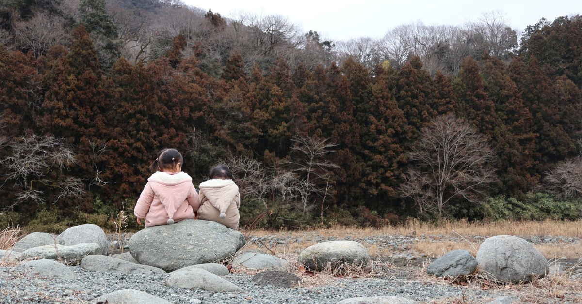 今回の投稿は、自然豊かな風景をバックに、子どもたちが石の上に座っている様子です。かわいらしい帽子付きのパーカーを着ている姿が、まるで小人のような雰囲気ですね!