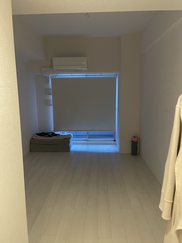 入居して間もないこともあり、Naさんの自宅はほぼ空っぽの状態。置かれているものはマットレスなど数点のみで、部屋は広々としています。壁や床、カーテンなどがすべて白色なのも、生活感のなさを際立てているようです。