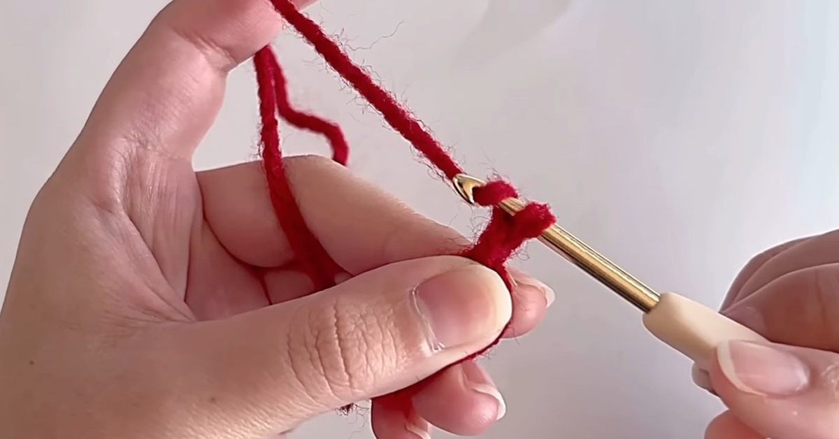 手前の糸の下から針を入れ、上から奥の糸をかけて引き出します。針を時計回りに180度回し、もう一度奥の糸をかけて引き抜くと、輪の作り目と1段目の鎖目が1目出来上がりました。糸玉の方が小指にくるように人差し指にかけ、親指と中指で糸を持ったら準備は完了です。