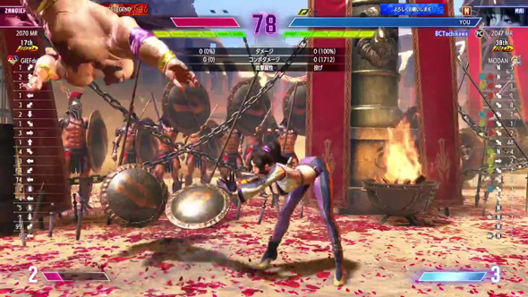 立川さんが操作しているのは、画面向かって右の「舞」という女性キャラ。対戦相手が操作するザンギエフに対して、開始から立川さんが攻め、投げ技が決まります。