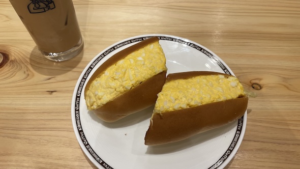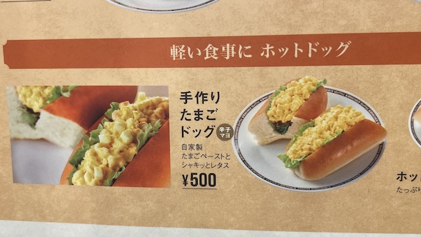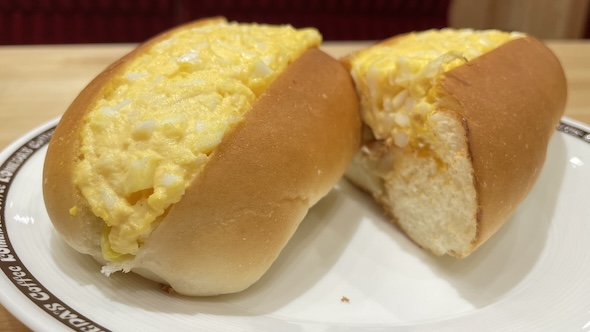 それは、メニュー上では「軽い食事」として紹介されている「手作りたまごドッグ」。食べやすいサイズなのかと思いきや……大きなパンに、たまごペーストがみっちり詰まっています! 「軽い食事」どころか、これ1つでお腹いっぱいになってしまいそうなボリューム感です。