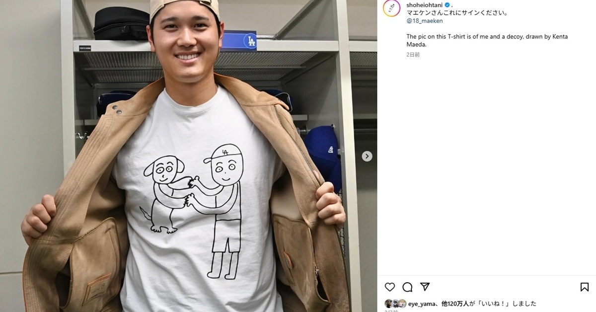 前田健太選手画のデコピンTシャツを着る大谷選手