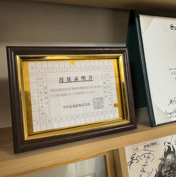 金色に縁取られたきらびやかな額縁に入っているのは、電車の「遅延証明書」。電車が遅れたときに駅などで誰でももらえる書類ですが、ふしぎと価値が高いもののように見えてきます。お手軽にすごいことを成し遂げたような気分になれて、飾っているだけでも自己肯定感が上がるかも!?