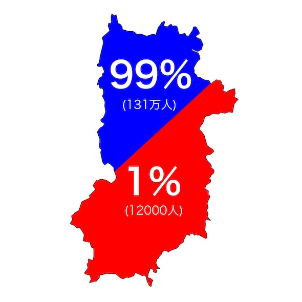 図によると、奈良県を斜めに南北に分割した場合、北部に人口の99パーセント(約131万人)が集中しているとのこと。一方で南部は同程度の面積があるとみられながら、1パーセント(約1万2000人)の人口しか分布していません。こんなに差があるとは……!