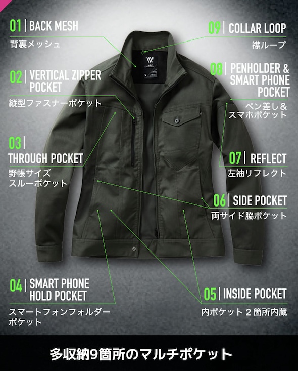 9カ所のマルチポケット付きで高い収納力を実現。UVカットや吸汗速乾機能のほか、背裏はメッシュで蒸れにくくなっていたりと、ハードなワークシーンでも活躍しそうなデザインとなっています。