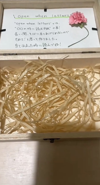 中には「体調が悪い時」「思いっきり泣きたい時」など、心細くなった彼女さんをそっと励ますような内容も。最後に「飛行機で読んでね」と書かれた封筒を入れて、ボックスは完成しました。“遠く離れていても彼女の支えになりたい”というijさんの優しさが伝わってきて、視聴者側も心がジーンと温まりますよね。どうかお二人の幸せがずっと続きますように……!