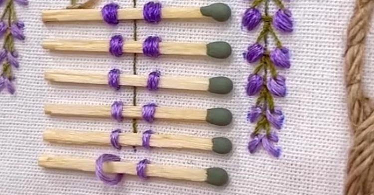 この作業を最後まで繰り返せば、木から紫色の花が垂れ下がる美しい刺しゅう作品が完成! マッチ棒を使うことで、花びらの位置が均等になり、バランスの取れた仕上がりになりました。