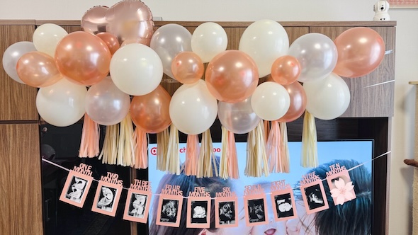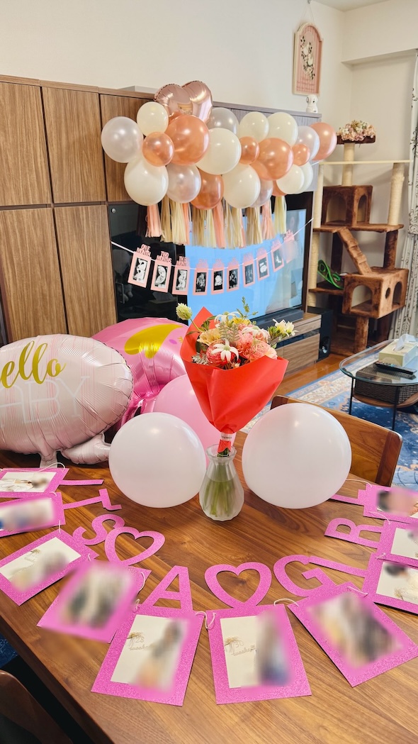 なんと、ねここさんの帰りを待っていた夫が家をきれいにデコレーションしていました! バルーンや花、写真などが部屋中にちりばめられています。出産を乗り越えたねここさんと新しく誕生した赤ちゃんを祝福するために、頑張って飾り付けをしてくれたのでしょう。なんてハッピーな空間……。