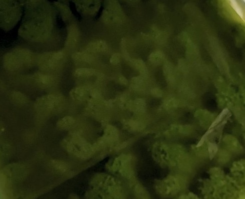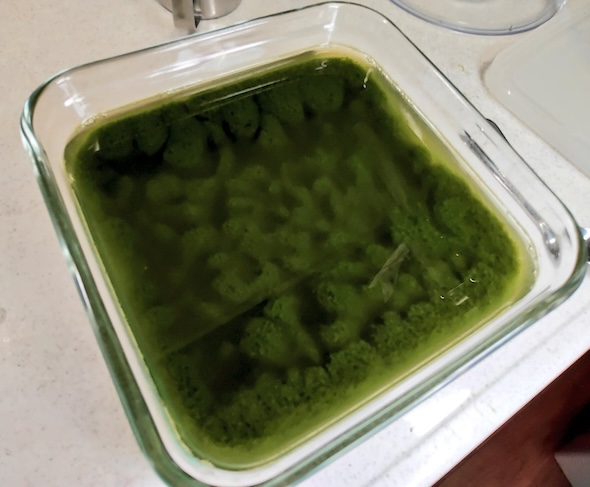 できあがったゼリーは、抹茶が溶け切らずに固まってしまったようで、さながら“藻が繁殖した池”のような見た目に……! 完成品を見た人からは「ボウフラ湧いてそう」と言われてしまったのだそうです。