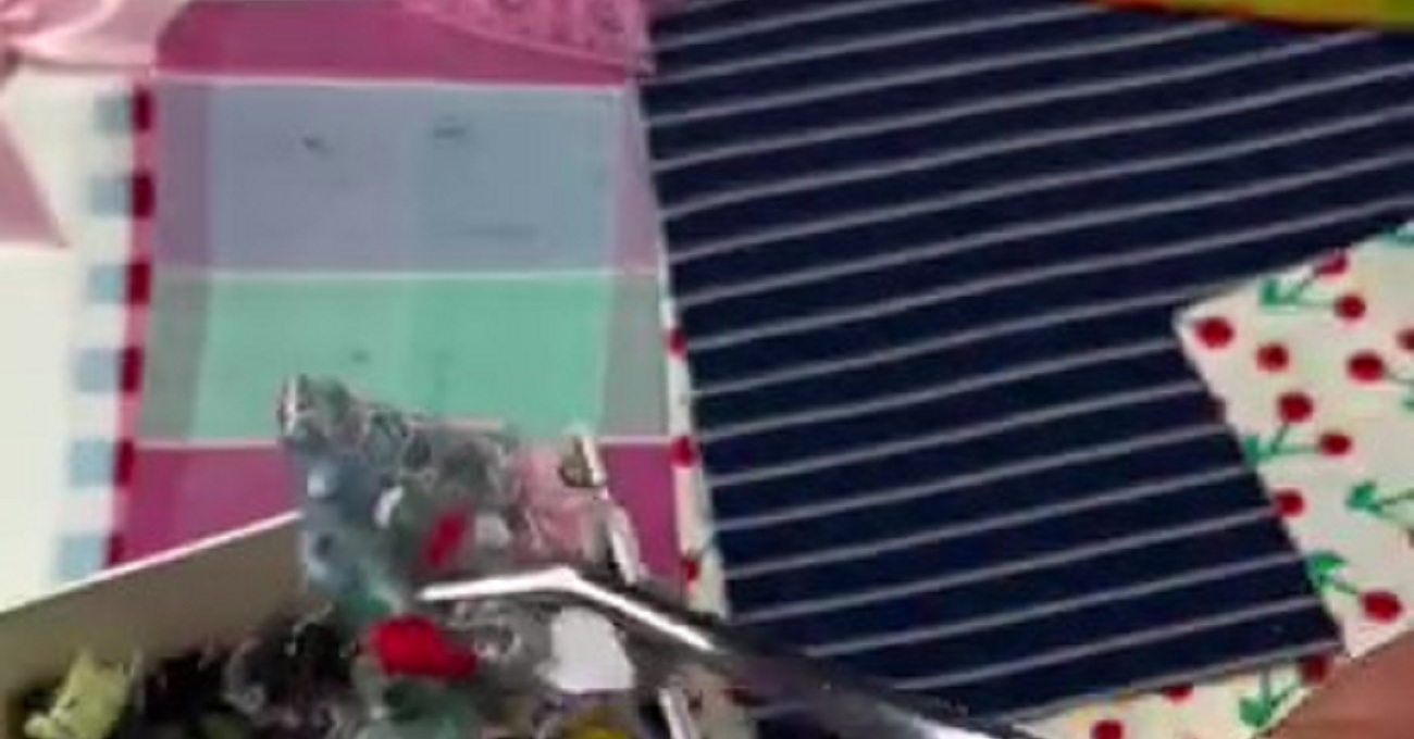 今回リディアさんが使うのは、作品制作の際などに出るハギレたち。チェックやストライプ、チェリー柄など、さまざまなプリントの生地が並びます。その中からリディアさんがチョイスしたのは、赤が入ったチェック柄と、同じく赤、そしてピンクのボーダー柄の2枚のハギレです。