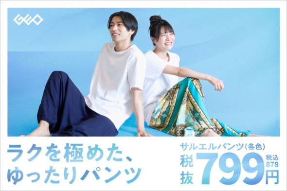 ゲオのサルエルパンツは、税別799円(税込878円)。全国のさまざまな場所にあって気軽に立ち寄れるゲオで、このユニークなパンツをこの値段で手に入れられる。