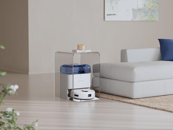 さっそく「DEEBOT mini」を空間に設置してみました。こちらはベーシックカラーのミッドナイトブラック(黒)。クリアブラックのウォータータンクと白い本体のコントラストがシックで、空間をぴしっと引き締めてくれます。本体もステーションもコンパクトなのでそこまで場所をとることもありません。