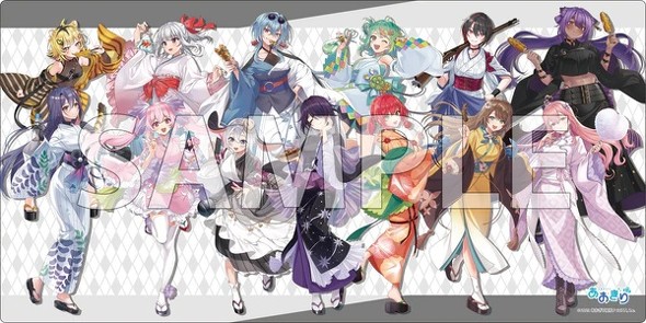 集合写真カードの絵柄。下段左から石狩あかり、音霊魂子、山黒音玄。二段目は我部りえる、栗駒こまる、千代浦蝶美。三段目は春雨麗女、萌実、エトラ、ぷわぷわぽぷら。最上段は八十科むじな、月赴ゐぶき、うる虎がーる