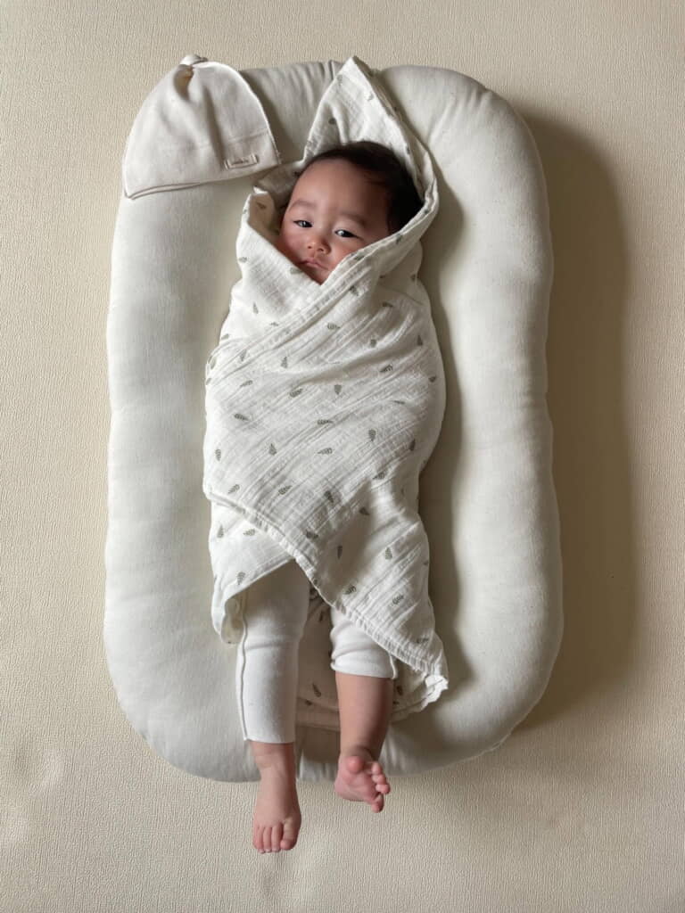 大きな布ですっぽりとくるまれ、白いベビーベッドで眠るとても小さな赤ちゃん。今、同じようにくるんでみたところ、足が大きくはみ出て布で包みこむことができません。ベッドからも飛び出してしまいます。帽子はどうやらかぶれなかったようで、端に置いてありました。