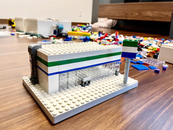 その後、レゴのファミマは拡張され、屋外のゴミ箱・灰皿や道路脇の看板も設置。さらに、息子くんが内装を手掛けました