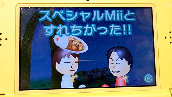 Mii(ユーザーのアバター)同士がすれちがい通信で交流する、内蔵ソフトの「すれちがいMii広場」を開いてみると、「スペシャルMiiとすれちがった」という表示が出ました。
