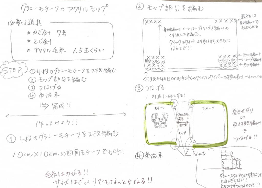 見た目のかわいさだけではなく、機能性やメンテナンス性の高さも魅力的ですね! 手書きの編み図も公開中です。