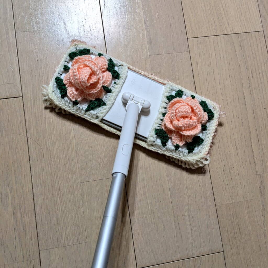 また、つら子さんはバラをモチーフにしたアクリルモップも制作しました。白い毛糸にオレンジのバラを2つあしらった心躍る作品です。