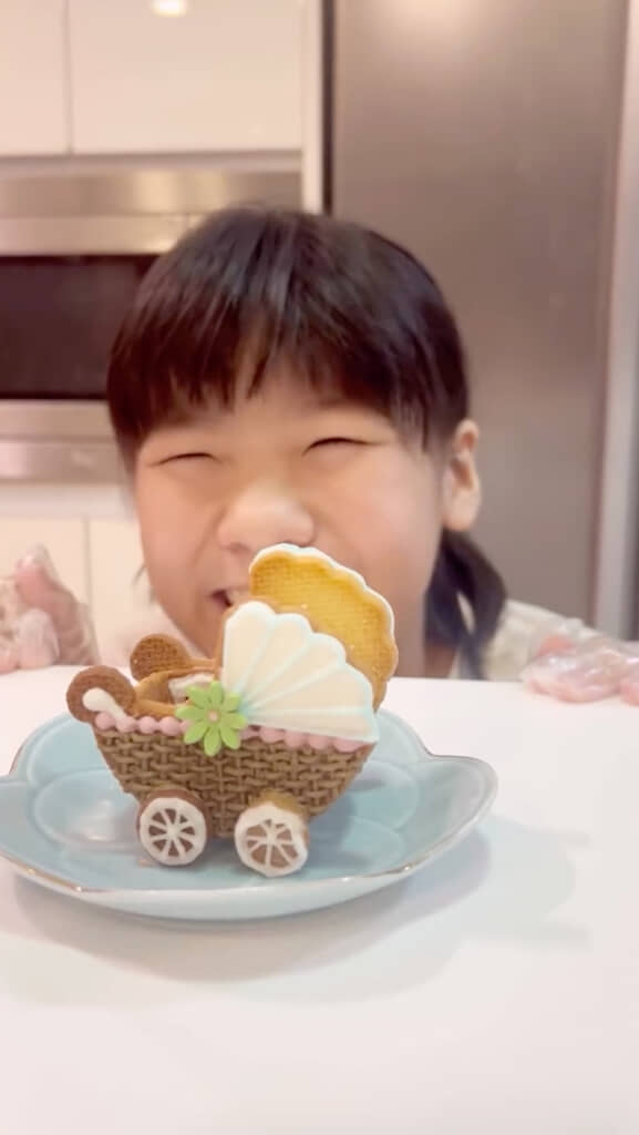 続いてクッキーを焼き、アイシング(粉砂糖に卵白や水、牛乳などを練ってペースト状にしたもの)でデコレーション。編み目などの細かい模様をどんどん描いていき、花や車輪のパーツを付けて組み立てると、かわいらしいベビーカーが出来上がりました!
